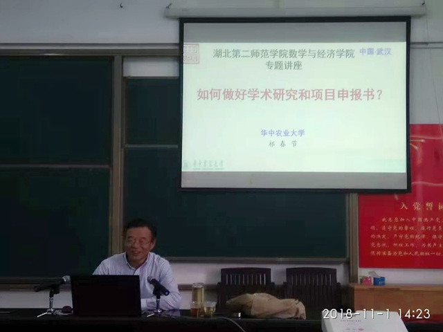 2018年11月1日下午,华中农业大学祁春节教授应邀参加我校金秋学术活动月的活动,并在数学与经济学院会议室(10号教学楼10202室)作了题为《如何做好学术研究和项目申报》的讲座。讲座由数经学院副院长李海雄主持,院长肖海燕出席本次会议。