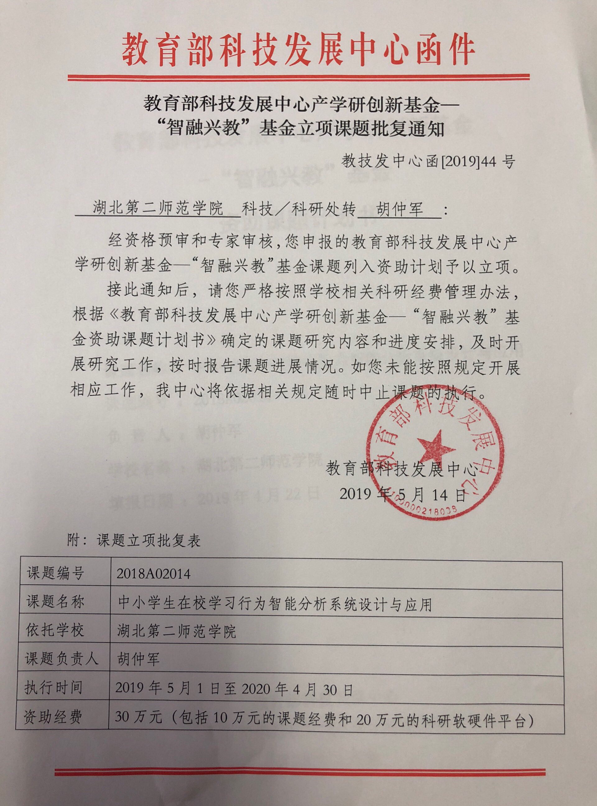 近日,教育部科技发展中心发来立项课题批复通知,由计算机学院何美章博士主导,胡仲军作为课题负责人申报的教育部科技发展中心产学研创新基金——“智融兴教”基金课题列入资助计划予以立项,资助经费30万元。这是我校首次获得教育部科技发展中心课题项目。