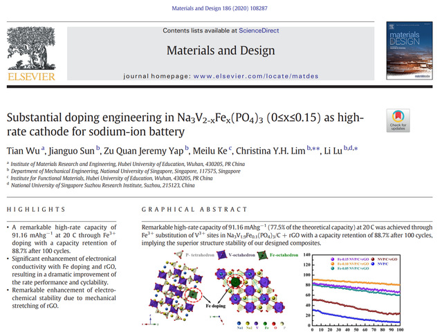 近日,我校材料科学研究院研究团队以湖北第二师范学院为第一单位,在国际材料科学顶级期刊《Materials and Design》(IF=6.289,中科院分区为一区TOP期刊)上发表研究论文《Substantial doping engineering in Na3V2-xFex(PO4)3 (0≤x≤0.15) as high-rate cathode for sodium-ion battery》。材料科学研究院吴田教授为第一作者,物机学院特聘教授、材料科学研究院首席教授吕力为通讯作者。