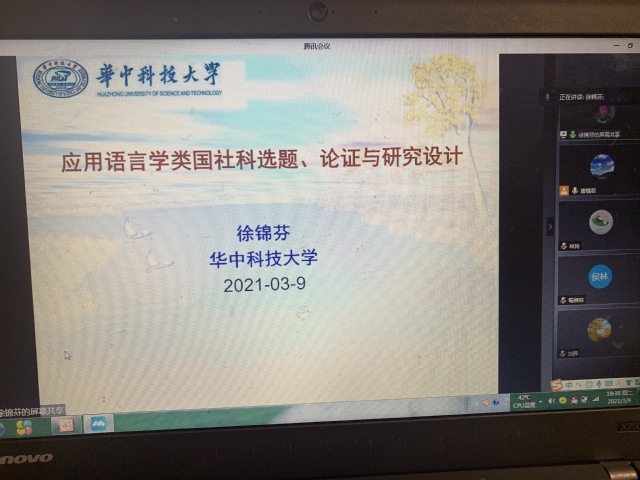 (通讯员唐植君)2021年3月9日晚上7:30,外国语学院召开2021年国家级科研课题申报指导会。会议在腾讯会议线上平台进行,邀请华中科技大学外国语学院徐锦芬教授为我院教师做申报指导。会议要求全体教师参加,尤其是本次提交国家社科基金、教育部课题申报书的教师、副教授、博士类教师以及青年教师。会议由科研助理唐植君主持,讲座前刘晖院长代表外国语学院对徐教授指导我院教师课题申报表达了由衷的谢意。