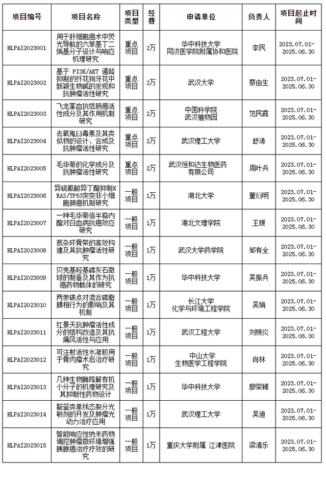 2023年“植物抗癌活性物质提纯与应用”湖北省重点实验室开放基金申请项目,经个人申请,学术委员会专家认真评审,现将拟立项项目予以公示。具体名单如下: